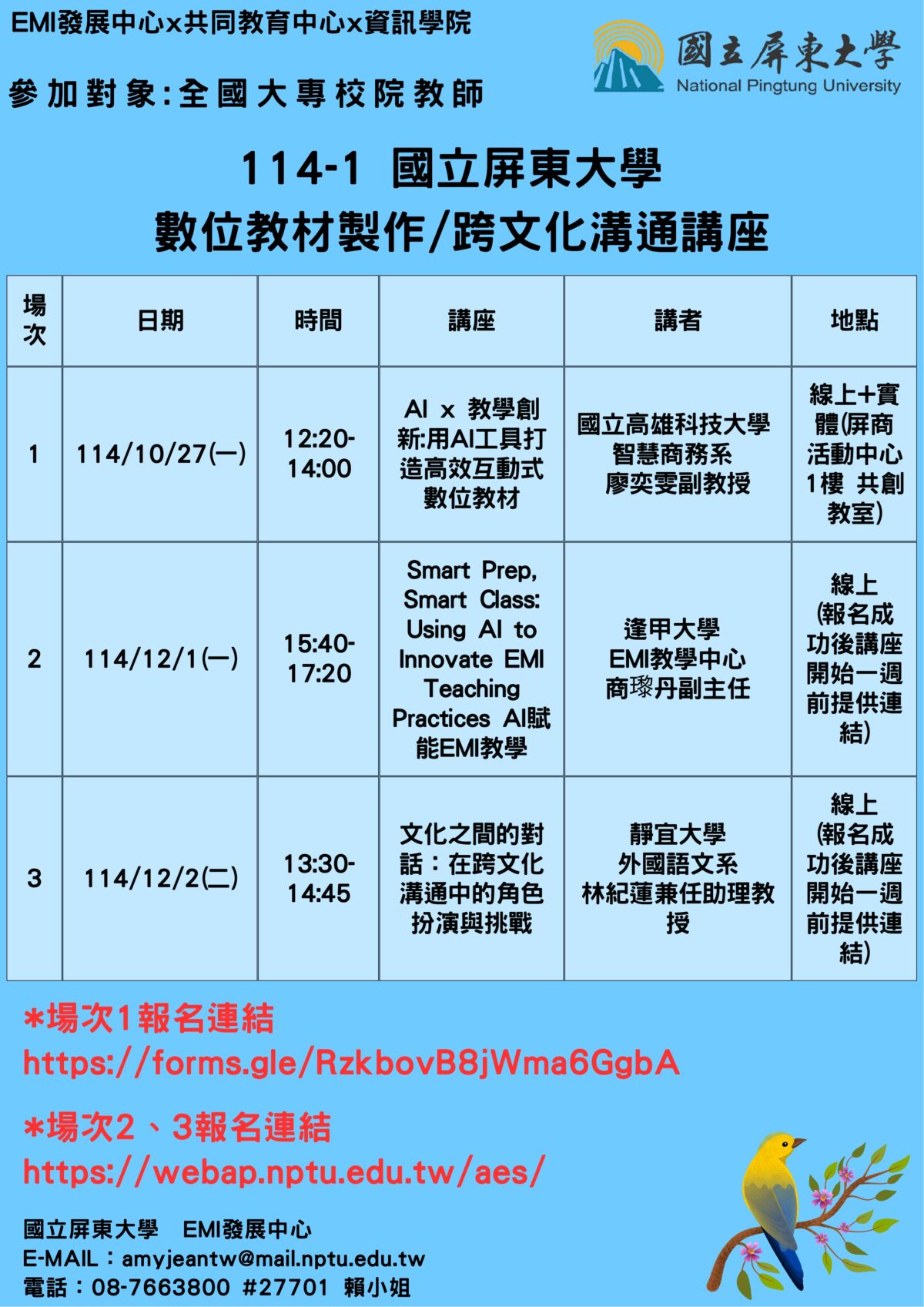 如有任何疑問,請洽本案承辦人 賴小姐,聯絡電話: (08)766-3800分機27701 ,電子信 箱: amyjeantw@mail.nptu.edu.tw。