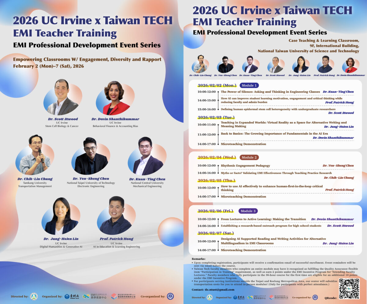一、本校EMI教學資源中心(以下簡稱本中心)配合2030雙語政策及大專校院推動EMI課程,於113年正式成立。結合技職院校與一般大學之實務教學特色,並提供各大專校院教學之資源,此次本中心與UC Irvine教學團隊聯手舉辦EMI教師培訓活動,以推動各大專校院EMI教師教學知能培訓,期望達到EMI教師教學增能之目的,並透過資源中心資源共享,合作共好之理念。