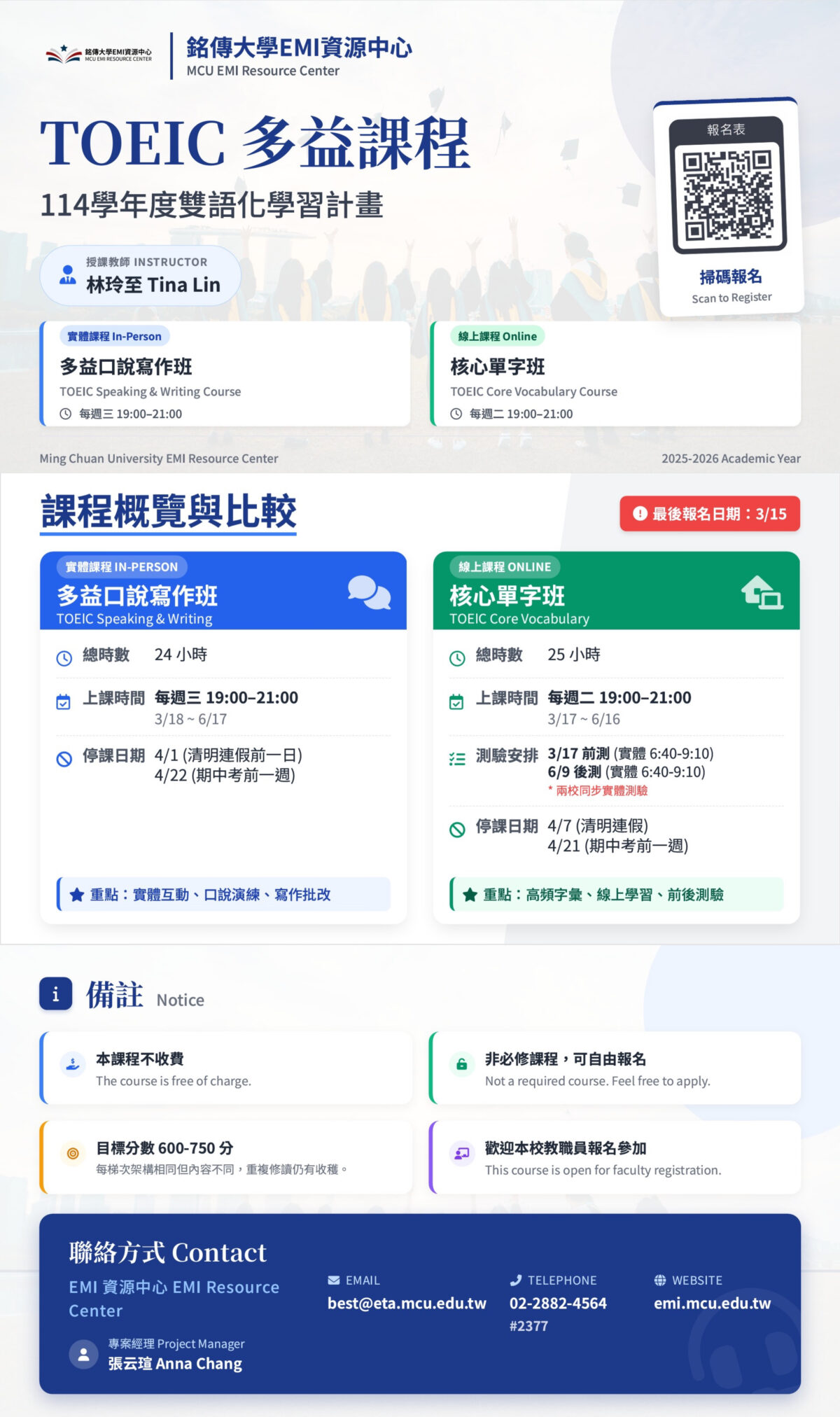 本班最後報名日期 Final Registration Date:3/15