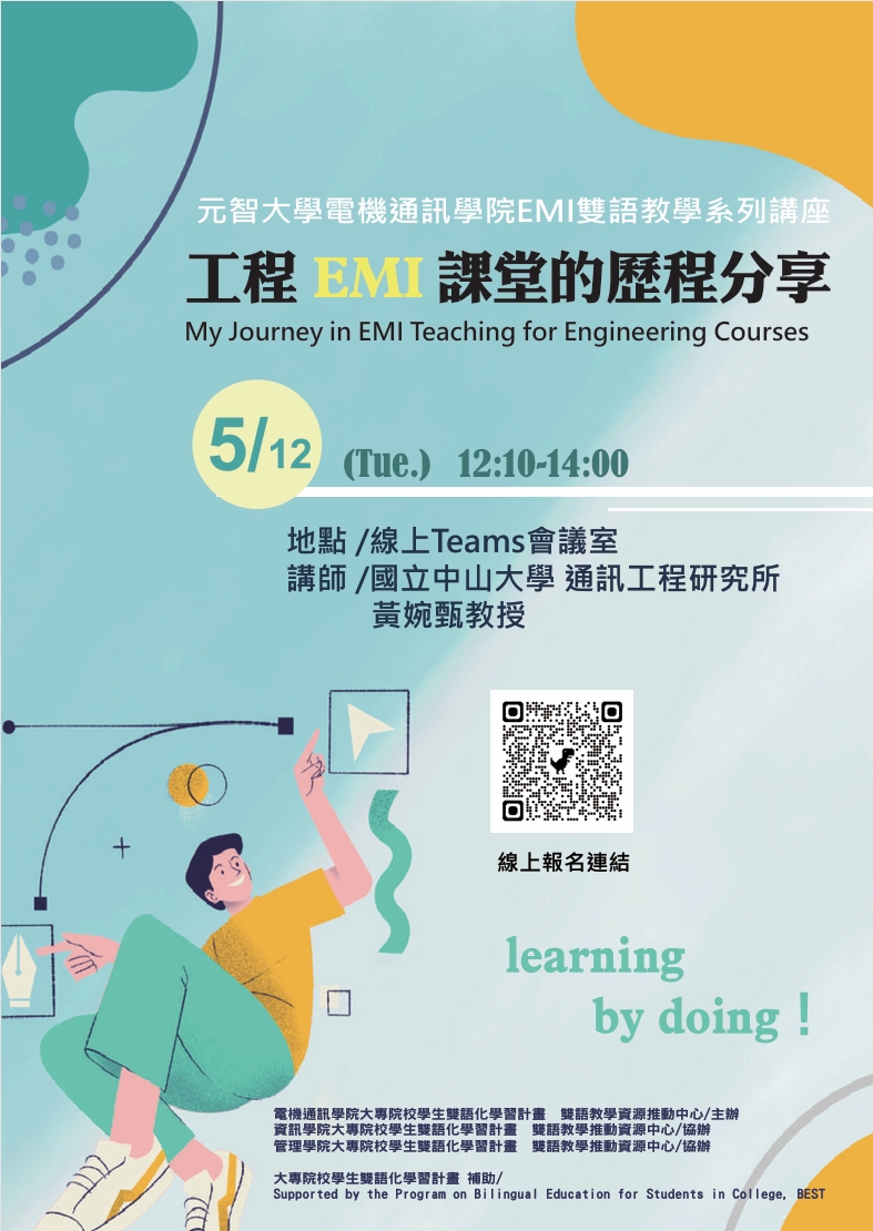 一、為增進EMI課程教學技巧,並提升教師EMI教學能力,本校電機通訊學院於114學年度第2學期辦理「EMI雙語教學系列講座」,歡迎各大專校院教師報名參與。